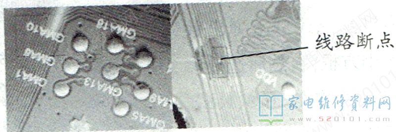 接修一台创维55G6液晶电视,故障表现为图像发白。上电测量TCON电路中的伽马电压,发现GMA10电压约为5V,正常应为7.8V。顺着此路电压线路查找,发现铜箔断裂,如图1所示。用铜线连接后试机,故障排除。