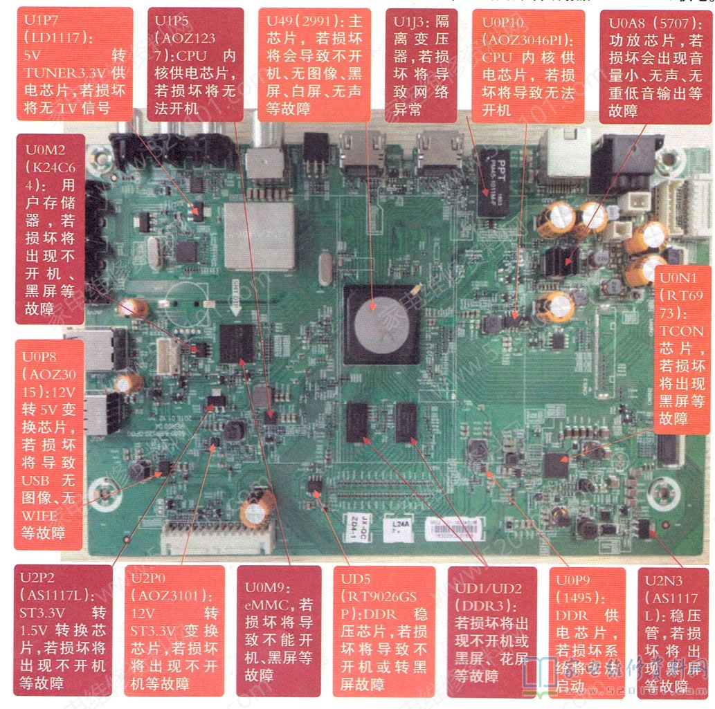 创维9R52机芯的信号处理系统中,U49(RTD2991 )为主芯片,UD1.UD2(H5TQ4G63CFR -RDC)为DDR3-1600MHz SDRAM;UOM4 (THGBMBG5D1KBALL )为eMMC存储芯片(8G Bytes e -MMCMODULE用于存储启动程序);UOM2( K24C64-SIRXA)为EEPROM程序存储器。信号处理电路的供电如下:电源板为主板提供12V、24V供电,12V_ NOR经UOP2稳压得到ST_ A3V3电压,一路给u49中的CPU供电;一路经过QOP2和QOP3控制产生D3V3, POWER EN信号控制D3V3的通断;一路经U2P2转换得到ST 1V8, ST_ 1V8经QOP6/QOP7控制产生D1V8,POWER EN信号控制D1V8的通断;:12V_ NOR经UOP8稳压得到5V_NOR电压;5V_NOR经U1P7转换得到TUNER3V3为高频头供电;12V_NOR经UoP9稳压得到DDR1V5电压,为DDR供电;12V_ NOR经U1P5稳压得到Core 1V0电压,为主芯片内核供电;12V_ NOR经UOP10稳压得到Core_1V0电压,为主芯片内核供电;24V给数字音频功放U0A7/U0A8供电。