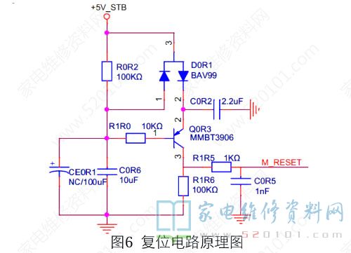 拆开测各电压和对地阻抗正常用示波器测晶振两端也正常,再测到复位电路时,发现不对劲,这个板子是高电平复位,应该只有一瞬间的高电平,但是现在Q0R3三端一直高电平(基级4.3v,其他2端都是4.8v),看来是这里问题了,看了下图纸旁边没有几个元件就全部代换后,用吹风机吹烫手都不会自动待机了,正常后的Q0R3基级为5.1v。
