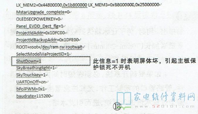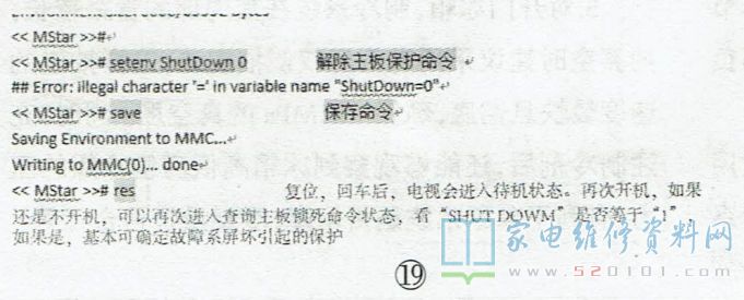 返回的信息出现“ShutDown=1",如图18所示,说明屏坏引起主板锁死。接下来输入"setenv ShutDown 0"、' save" 、“ res"三条命令,解除主板锁死状态,如图19所示。