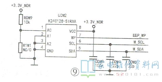 UOM2用于存储用户设置、开机状态.MAC地址、KEY码、数字电视序列号、串货条码等信息,其⑤脚为串行数据线,⑥脚为串行时钟线,⑦脚为写保护控制端,相关电路如图9所示。