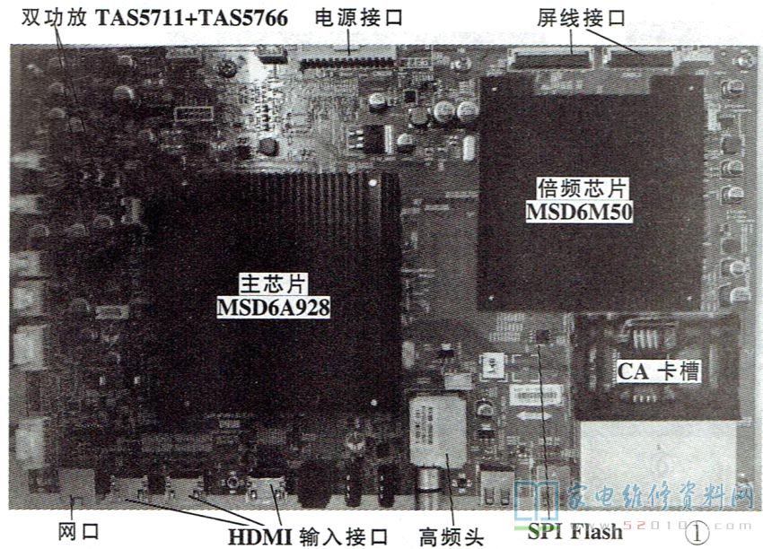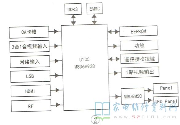 创维S9300系列OLED彩电(8S87机芯)是一款4K OLED高端产品,具体机型有55S9300和65S9300,采用Mstar公司的MSD6A928+MSD6M50倍频方案,并采用创维专为电视设计的酷开5.0操作系统;安装有四核ARM cortex-A17,CUP最高频率为1.8GHz,六核ARM Mali-T760 GPU,双核V-Engine VPU,2.5G DDR3;支持4K 3D、2T USB、64GSD.All-HD单芯片一体机、DTMB地面数字电视;内置千兆双频WIFI、蓝牙4.0、 WIFI Direct.Hotsport;具有微信点播DLNA.AriPlay、Mieacast等功能;JBL全音域音响组合,具有JBL音效、DOLBY、DTS解码、TruSurroud、语音、空鼠交互功能,最大分辨率为3840X2160@60Hz,支持偏光3D及HDR功能。该系列彩电的主板实物图如图1所示,电路结构框图如图2所示。