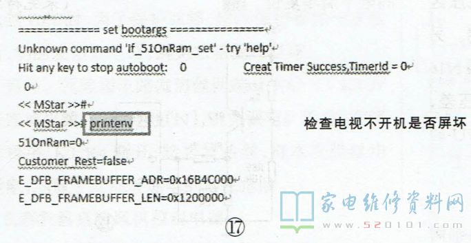 例2:一台S930系列液晶彩电,上电后电源指示灯闪烁。分析检修:本系列OLED产品的指示灯规律如下:主板锁死一呼吸灯不亮,电源指示灯闪烁;数据恢复一呼吸灯常亮,电源指示灯闪烁。结合故障现象分析,此机屏体进入自锁状态,说明主板或操作系统异常,或者主板误动作,须人为解锁进行确定,具体操作如下:连接TV160刷机盒子(或串口小板),打开超级终端软件,敲击电脑ENTER键,插上交流电源,直接打印信息停在BOOT命令状态:输入' printenv"查询信息,如图17所示。