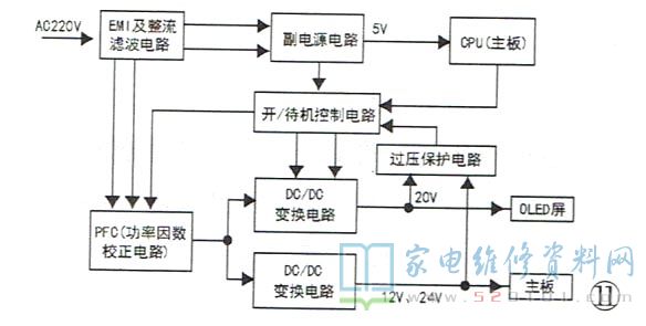 创维55S9300电视采用板号为168P-P8F052-00的电源电路,它由EMI滤波、副电源、功率因数校正DC/DC变换、开/待机控制过压保护等电路组成,其框图如图11所示。