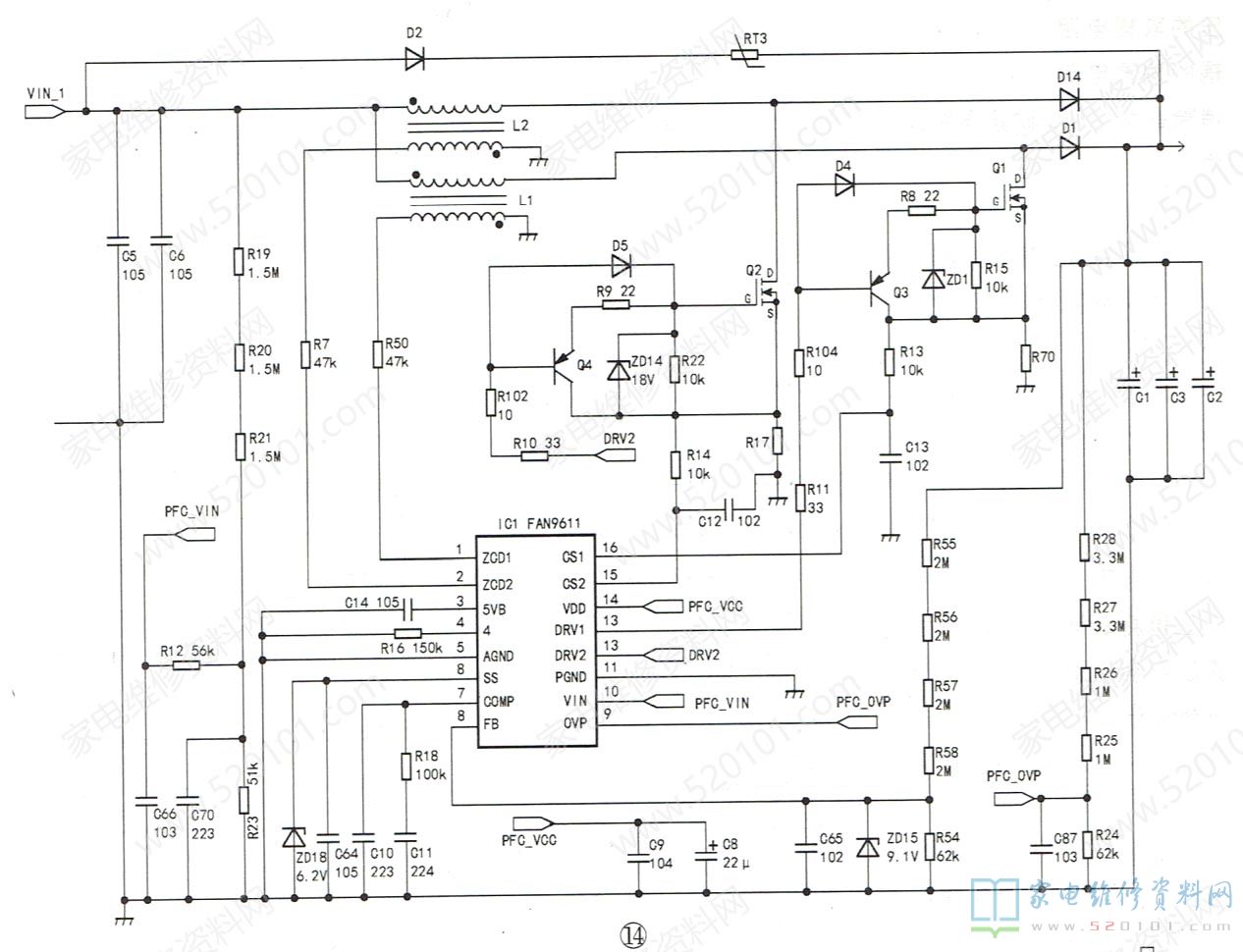 IC1(FAN9611)为PFC控制IC,L1、L2、Q1、Q2、D14、D1组成PFC升压电路,D2为分流二极管,R14.R17.R13.R70为过流检测取样电阻;R24~R28为PFC电压检测取样电阻;C1~C3为滤波电容;C10.C11.R18为环路补偿元件。