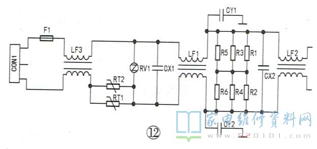 该电路如图12所示,F1是保险丝,RT1、RT2是限流电阻,RV1是压敏电阻,CY1、CY2是共模滤波电容,LF1、LF3是共模电感,CX1、CX2是差模电容,R1~R6是泄放电阻。