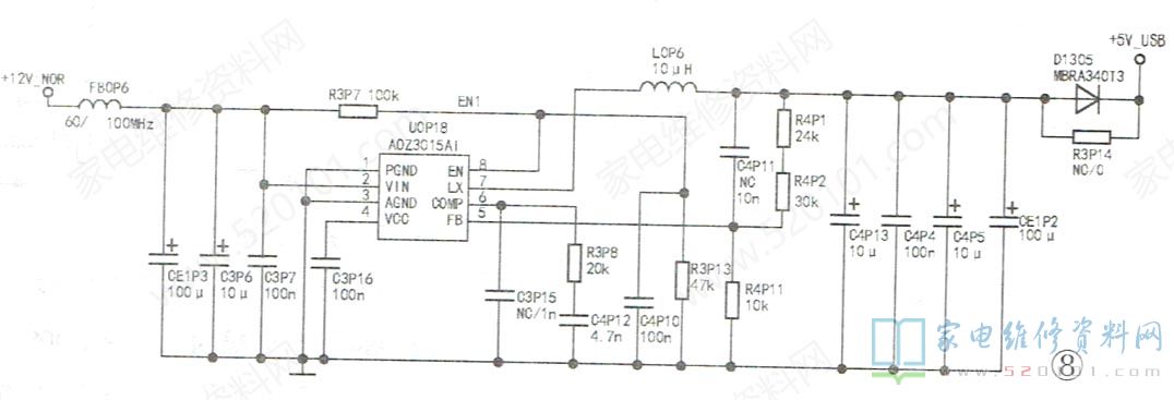 该电路如图8所示,电源板DC/DC变换电路送来的12V供电加到以UOP18为核心的DC/DC变换电路.上变换得到+5V USB供电,给主板上USB电路供电。