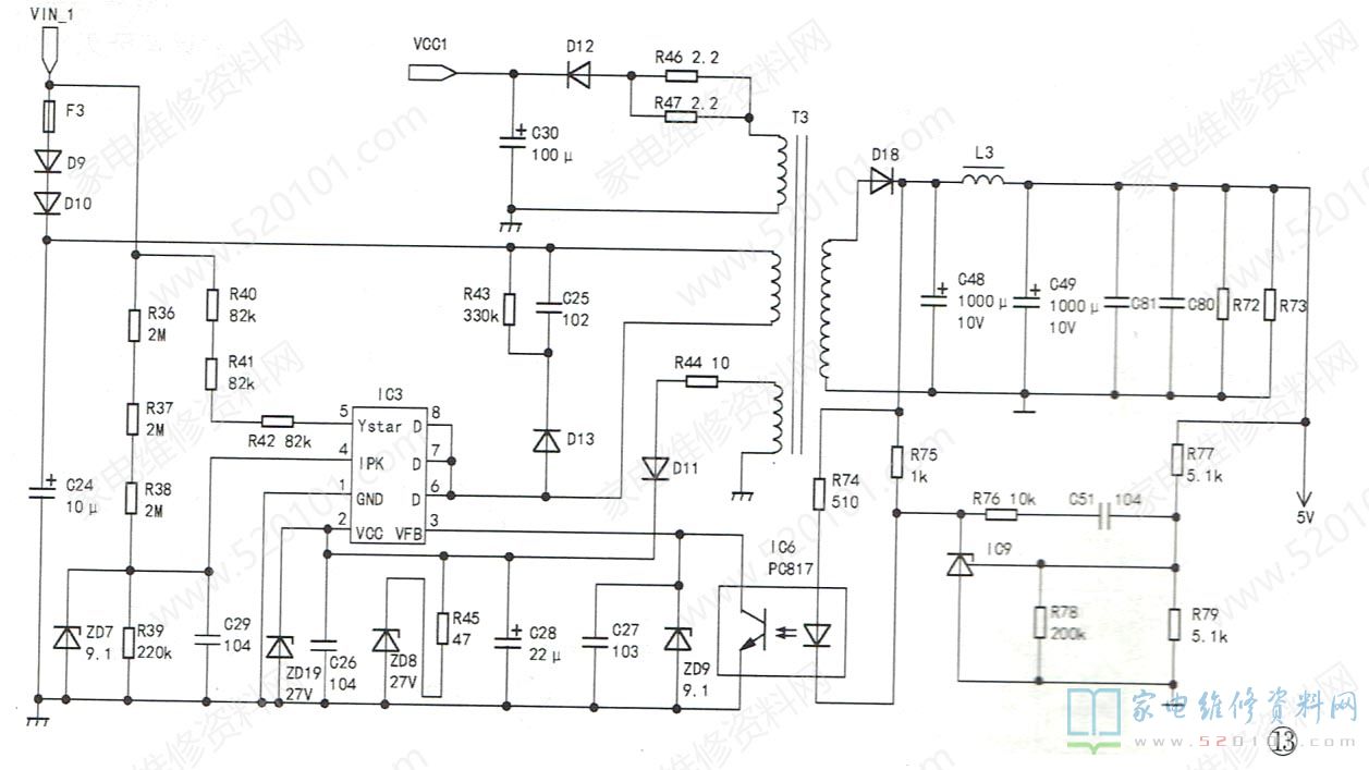 该电路如图13所示,IC3(FA8A01)为开关稳压电源控制IC,T3为开关变压器,IC6(PC817 )为光电耦合器;R43.C25.D13组成尖峰脉冲吸收电路,用于保护IC3内部的功率开关管;R77、R79是5V稳压的取样电阻;R74是IC6光耦的偏置电阻,C51.R76用于消除寄生振荡,防止电路误动作。(3)PFC功率因数校正电路该机采用交错式临界导通模式(BCM)功率因数校正电路,如图14所示。
