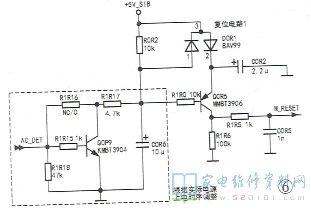 该电路如图6所示,在开机瞬间,+5V STB电压分两路送给复位电路:一路经DOR1给COR2充电,待充满电后给QOR5的发射极供电;另一路经ROR2给COR6充电,待充满后经R1R0给QOR5的基极供电。上电后Q0R5由截止变为饱和导通,随着COR6不断充电,QOR5会由饱和导通变为截止,即U1的复位脚(B1)的电平变化是:低电平一高电平一低电平,从而完成高电平复位。