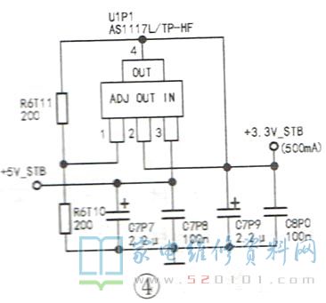 该电路如图4所示,电源板上副电源电路送来的+5V_ STB电压经稳压器U1P1 (AMS117L/TR-HF)稳压,得到+3.3V_ STB供电,给U100中的待机CPU供电。