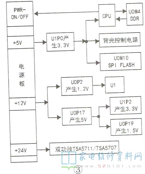 电源板送出+5V STB供电给主板,经U1PO得到+3.3V_ STB给CPU供电;另外,+3.3V_ STB还给背光控制、SPI FLASH等电路供电,如图3所示。CPU得到供电和复位电压后外围晶振起振,CPU开始工作。MSD6A928(U100)内的主控系统先与UOM4进行通讯,然后主控制器运行UOM4内的启动程序(Mboot)。