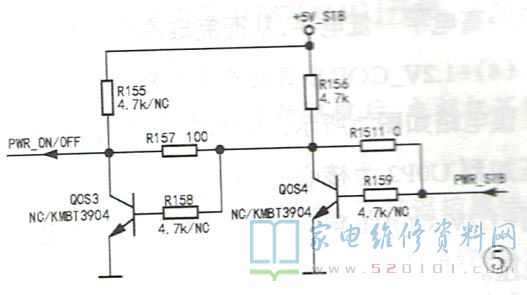 该电路如图5所示,U100正常工作后,其C2脚输出M_ PWR-ON/OFF开机信号(高电平),则QOS4的集电极为低电平,Q053截止,其集电极输出高电平开机信号,经插座CNOS1的④脚送往电源板,电源板正常工作,输出12V.24V电压。