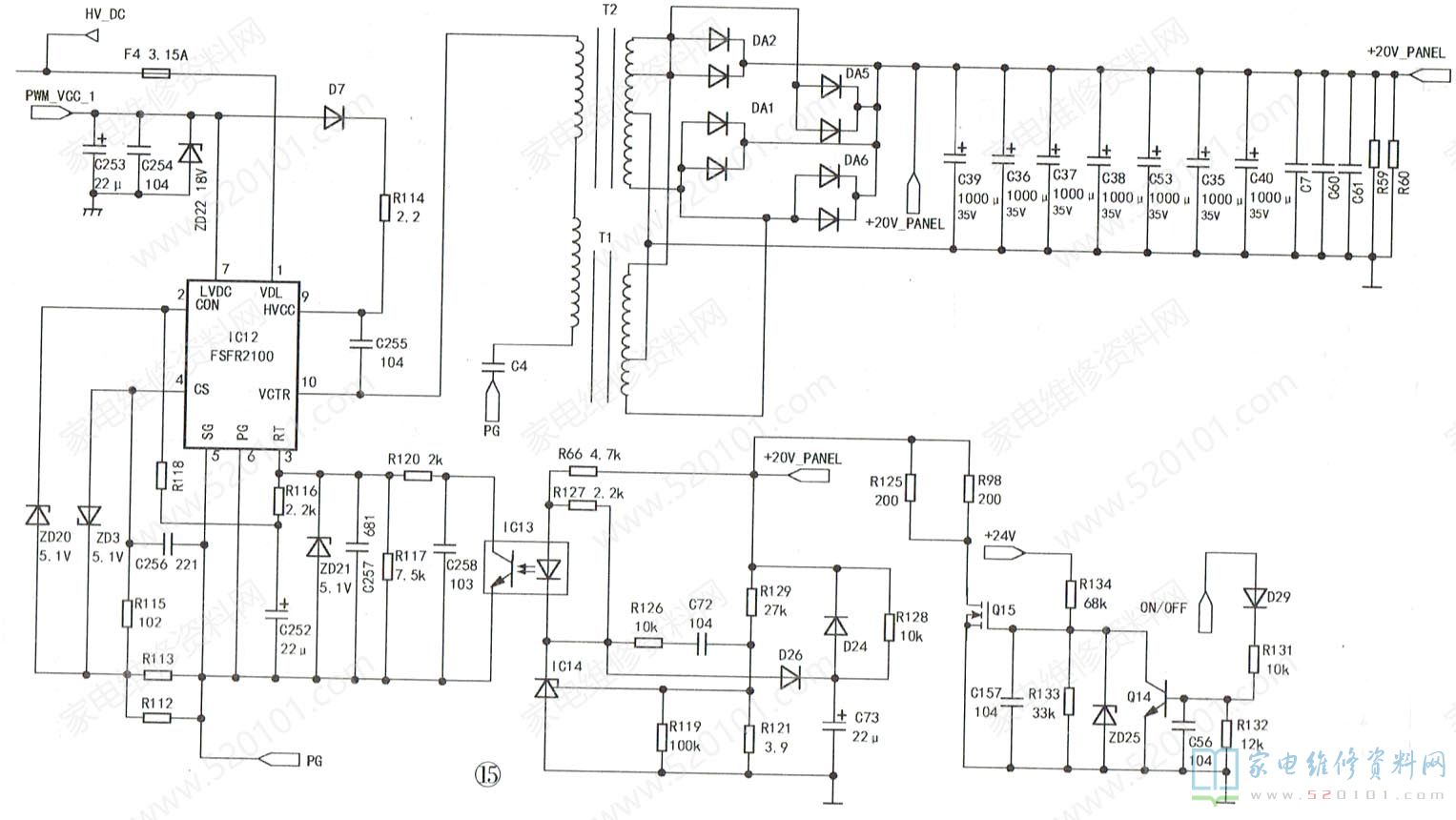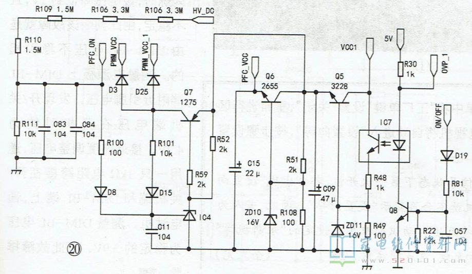 分析检修:此机电源指示灯和呼吸灯都不亮,这既不符合数据恢复状态特点,也不符合屏锁状态的特点。为快速判断故障部位,试用TV160刷机盒子进行解锁,无法成功,说明故障出在电源板或负载部分。拆机维修,实测电源板输出的5V电压正常,待机控制STB信号电压为1.5V,也基本正常,但无12V和24V电压输出,检查负载未发现短路现象,确定故障在电源板上。检测PFC电压为380V,正常;vCC电压为18V,也正常,判断PFC电路和副电源电路正常。检查主电源电路,测IC1(FAN9611)的①脚电压为380V(正常),14脚vcc供电为10V,低于正常值18V很多,说明此路供电有问题。IC1的14脚供电电路如图20所示,副电源初级绕组的感应电压经D12.C30整流滤波后得到vcc1电压(见图13),再经Q5.Q6稳压后输出,为主芯片和PFC芯片供电。检查上述元件,发现Q6损坏,换新后开机,测得IC1的④脚供电为18V ,此时主电源输出的12V和24V电压均正常,故障排除。