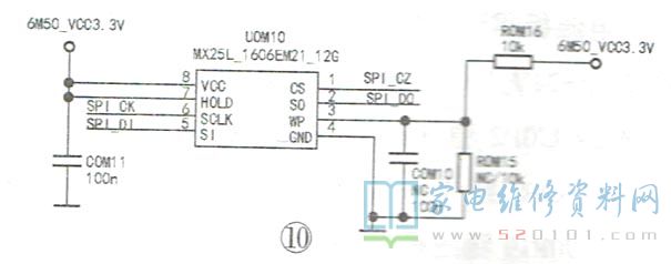 (7)SPI FLASH 电路UOM10是一款16Mbit串行FLASH,用于存储6M50的引导程序,其电路如图10所示。①脚为片选控制输入,②脚为串行数据输入/输出,③脚为写保护控制,④脚为接地,⑤脚为串行数据输入输出,⑥脚为时钟输入,⑦脚为暂停控制,⑧脚为供电。