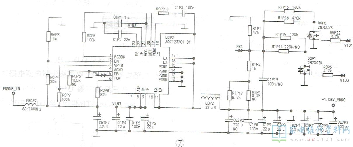 该电路如图7所示,电源板送来的+12V NOR电压加到UOP2为核心的DC/DC变换电路上变换得到+1.2V cORE电压,作为主芯片内核电路的工作电压。