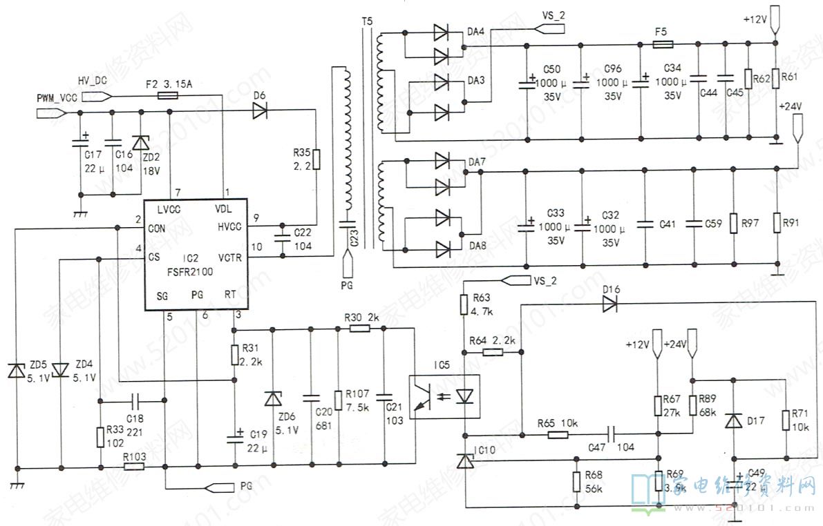(5)+12V、+24V DC/DC变换电路该DC/DC变换电路如图16所示.IC2是高效率半桥谐振开关电路,T5为脉冲变压器,R35为限流电阻,R103.R33是电流检测电阻;R69.R67为取样电阻,IC5为光电耦合器,IC10为具有电压基准的精密稳压集成电路,C47.R65用于防止寄生振荡。