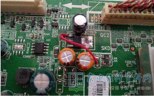 接修一台创维42E380S液晶电视,故障表现为亮绿灯不开机,开盖测得电源板电压正常,当测量到U24时,发现+3.3V只有3.2V,原机为LD1117可调稳压块,手头上只有3.3V普通稳压块,换上,拆除原机调压电阻,再接一条线到负极,通电试机,+3.3V正常,机器也正常开机了。