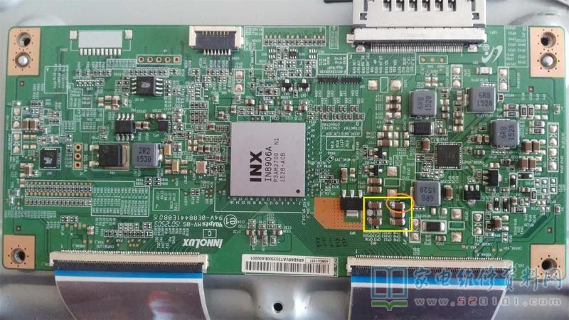 接修一台创维40E6000液晶电视,故障表现为灰屏,背光亮。通电用遥控开关机正常,初步判断是屏线、逻辑板问题;开盖检查屏线未见异常;逻辑板和屏是分开的,测逻辑板12V正常,VAA、VDD、VGH、VGA均为0,测这几路对地阻值均不短路,该逻辑板电源IC为CM508,网上资料有限,其第7、15、16、26为12V供电脚,第31脚PWRON电压3.3V,怀疑该芯片问题,网购了一块换上后故障依旧。此时因资料有限,于是围绕CM508排查各大滤波电容,当测到黄圈中电容时,其对地只有47欧阻值,应该是不正常的。拆掉这6只电阻测量发现是红圈中电容损坏。拆掉该电容恢复电路再测在路阻值在十多千欧,通电还是灰屏,但此时VGL电压出现了为-7.9V,其它电压依然为0,再测VAA\VDD\VGH阻值,发现VDD对地有600欧左右,测换下来的CM508该脚对地无穷大。判断应该是新换上的CM508不良,换回原机CM508通电逻辑板4组电压出现,上机故障故障排除。