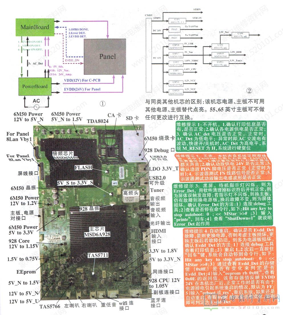 创维8S87机芯以Mstar的6A928为主平台,搭配MEMC芯片6M50,软件基于Android4.4,搭载酷开5.0系统。采用ARM cortex A17四核处理器,主频高达1.4 GHz~1.7GHz,采用32bit RISC处理器,512MB二级缓存。最大分辨率支持3840x2160@60Hz;机芯硬件配置三通道2.5GB DDR3内存和16GBytesEMMC5.0的存储空间,四核MaliT760MP4图形处理器。创维8S87机芯液晶彩电的系统框图及主板供电流程如图1、图2所示。