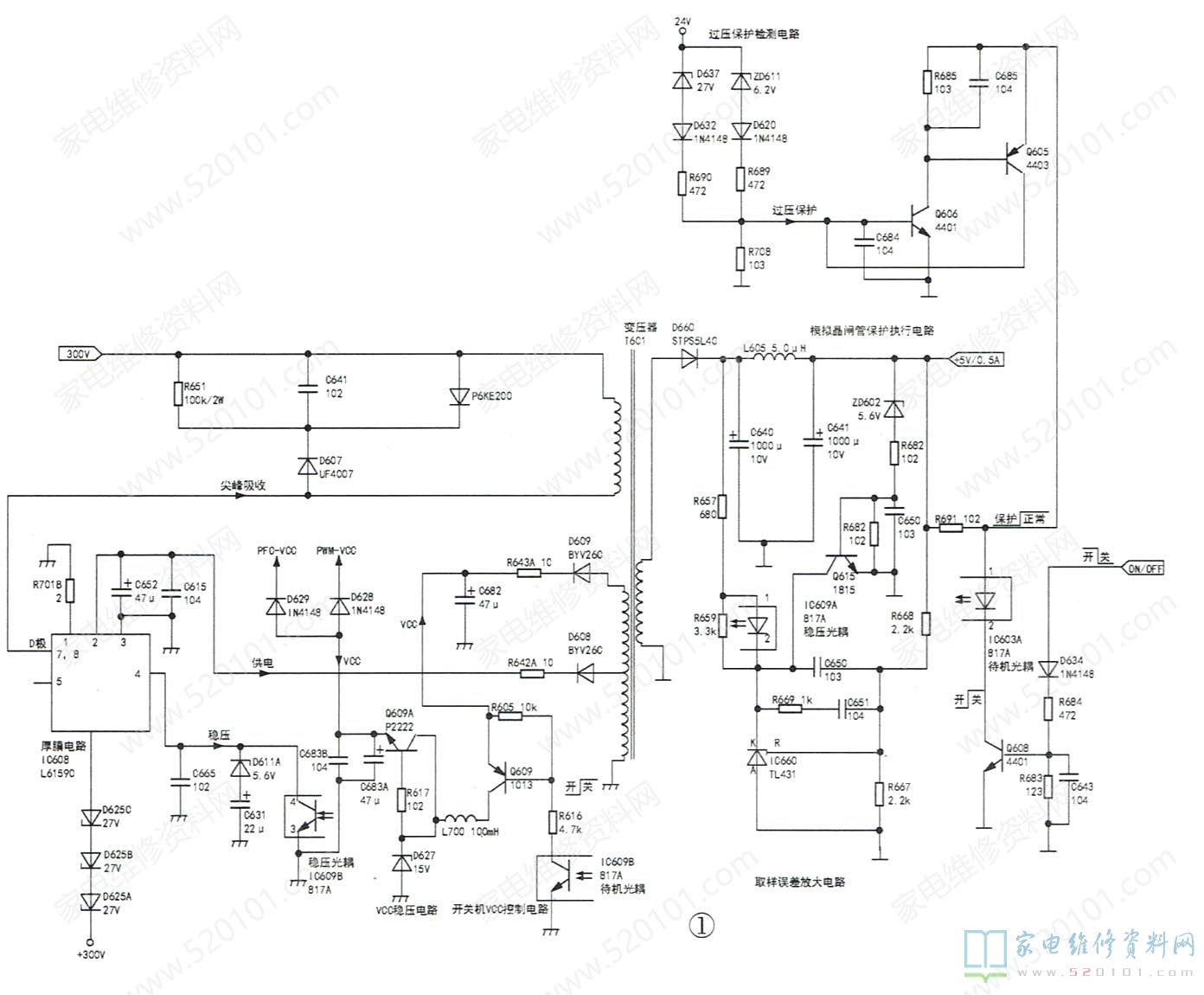 上电测得市电整流滤波后的+300V电压正常,PFC电压为375V(正常),副电源辅助绕组D609整流、C682滤波后的vCC电压在9V~10V间波动(低于正常值16V),副电源厚膜电路IC608(L61590)的②脚(vCC)电压在10V~11V间波动,判断IC608和PFC、主电源驱动电路VCC供电过低,造成电源板输出电压过低且不稳定。试将滤波电容C682由47uF/25V改为100uF/25V,C652由4.7uF/25V 改为47uF/25V后试机,副电源输出的5V电压正常,二次开机后主电源输出的12V和24V均正常,故障排除。