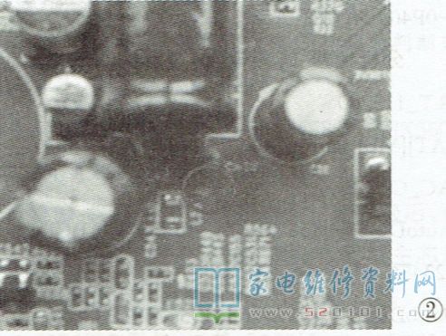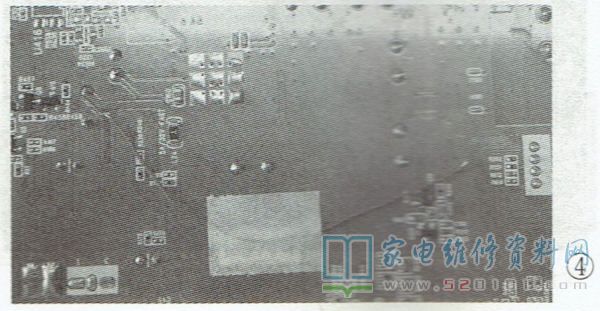 例5:42E5DHR -8M09型机(机芯:8M09),无伴音或热机无伴音。分析检修:此故障多为静音电路动作,使功放块的AMP -PDN脚为低电平,从而导致功放块进入待机状态而无伴音。具体原因是POW-ER MUTE信号与SD卡控制信号的线路过孔漏电,使得Q15因基极为高电平而静音。解决方法:先切断主板正面L55附近的铜箔,如图2所示,再切断图3中圆圈里的铜箔,最后用导线连接好相关断点,如图4所示。