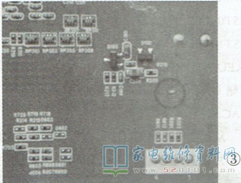 例2:42L28RM型机,机芯:8G28(5800-A8G200-0030),开机后蓝屏(死机)。分析检修:根据以前的维修经验得知,此故障原因是DDR与主芯片通讯异常。用万用表的二极管挡测试DDR与主芯片之间的排阻,发现RN15损坏,更换RN15后故障排除。