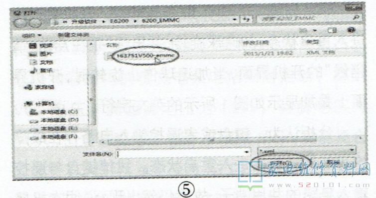 (2)先选择“烧写eMMC"功能(见图3),点击“浏览”按钮(见图4),选择分区文件"Hi3751V500-emmc.xml" ,并打开(见图5),最后勾选fastboot ,并点击“烧写”即可(见图6)。