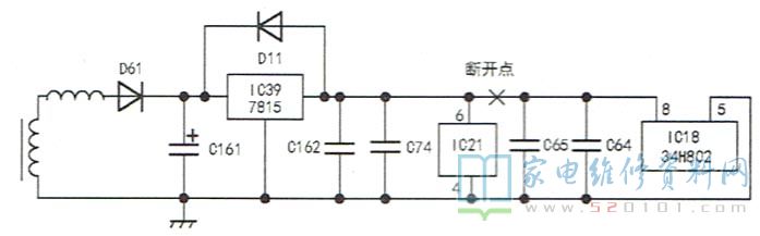检测次级各路输出电压,IC36、IC38有+15V,IC37有+5V,IC39输出电压只有1.6V左右,不正常。断开IC39的输出端,输出电压仍不正常,确定IC39损坏。换新后测其输出电压约为2.1V,同时温度上升较快。用万用表电阻挡测IC39输出端对地有1002 左右的电阻值,确定有元件漏电,IC39所供电的负载为IC18和IC21,如图1所示,区分是IC18或IC21及其周边元件损坏时,可取下IC18上方的散热片,切断IC21⑥脚后的线路,再测量相关位置的在路电阻,最后确定是IC18及周边元件有漏电元件。首先挑开IC18( 34H802 )的供电端⑧脚,漏电情况不变;当拆掉C65后,短路情况消失。更换损坏的C65,并恢复线路后试机,故障排除。