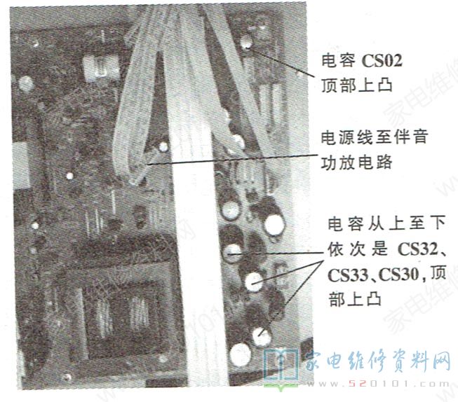 这几只电容分别是+5V、+12V、+24V的滤波电容,在电路板.上的代号为CS02、CS30、CS32、CS33。将这几只电容换新后试机,故障排除。