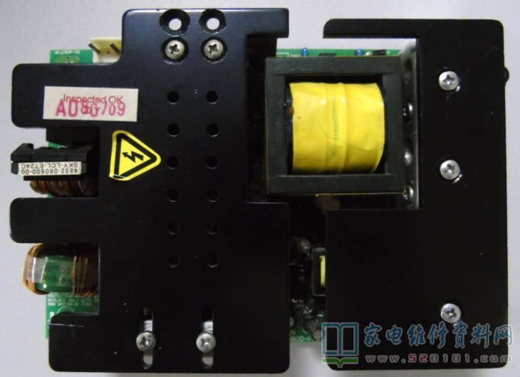 接修一台创维32L02型液晶电视,刚开机后图像、伴音均正常,经过三四分钟后,图像开始闪烁。此机采用5800-PLCD32-05型电源板,在故障时,测得380V电压正常,12V电压只有7V左右,24V电压只有18V左右,这应该是电源带载能力差,或者稳压环路出现问题。查各路输出滤波电容均正常,测量IC605 (AK431) 周围元件都正常,测量C650(0.22uF/50V )时,表针不稳定。拆下用万用表Rx10k挡测量,该电容明显漏电,换新后故障排除。