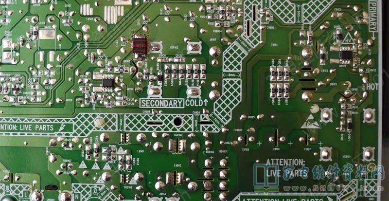 接修一台创维32E309R液晶电视,客户说通电电源灯不亮,心里想肯定是电源板问题,拆机检查两个大电容有300v电压,说明肯定不是保险丝了, 然后检查变压器初期有300v电压,次级没有电压,一般次级没有电压不是保护了就是短路了,首先检查主要的三极管,发现有个三极管Q9102(AOTF298L场效应管)不正常D级和G级直通,我并没有急着拆三极管,查了下周围电路发现一个二极管击穿D9108(MB510肖特基二极管),拆下二极管测量三极管,三极管正常。