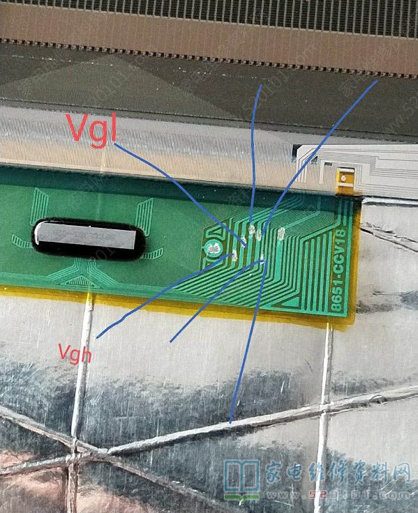 接修一台创维26S15HM液晶电视,开机有时正常有时白屏,网上查为通病,屏上的故障,没有VGH电压,开屏后发现,网上资料那个飞线的屏和我这个不太一样,也找不到VGH,多翻翻后又发现一个师父发的图片和我的机子一样,但是图片被压缩的太模糊了,但大概能看到是靠左边的那几根线,拿手机开4倍镜后用手术刀刮开线,然后打表一根一根试,刮了几根后总算通了,但阻值不太稳定,估计故障就在这里,飞线连接逻辑板VGH,试机收工。这机子主要是要找到屏边上那个VGH,不然就算知道是少电压也不知道飞哪根线,下图仅供参考,为以后碰到的朋友减少点时间。