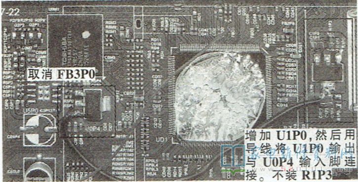 3、更改功放块④、11脚外接电容的接地端。将电容C0A6和C0A2接地端悬空,再用导线将两只电容的悬空端接到电感FBD3靠芯片一端的引脚上,如图4所示。另外,在C3P0上并一只75kΩ电阻。