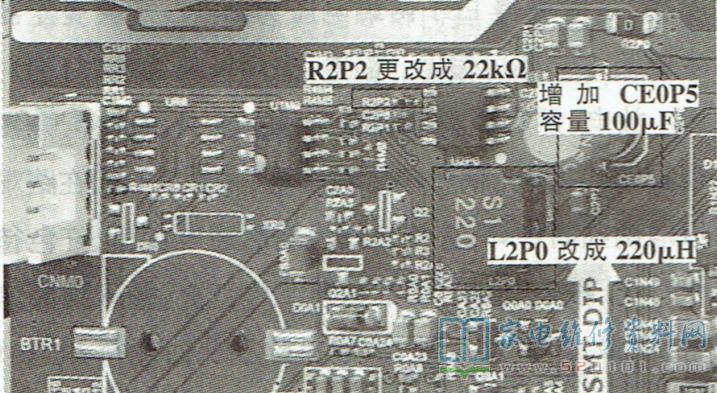 1、将R2P2从47kΩ改为22kΩ,将L2P0从10uH改为22uH,增加CE0P5电容(100uF),如图1所示。