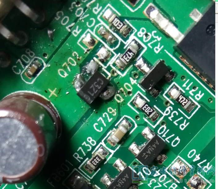 接修一台创维32E59RM液晶电视,故障表现为不定时出现不开机问题,不开机时呈现三无现象指示灯也不亮,电源板5V电压只有4.7V正常开机后电源板5V电压在5-5.2v左右。此机单独强制开启电源板无12v、24v电压输出,必须接主板才能正常开机。为此走了弯路以为是5V电源故障最后确定故障在主板,此款机通病是数据容易出问题,但是刷机后故障依旧,最后检查出主板5V开关管Q702不良更换后故障排除。