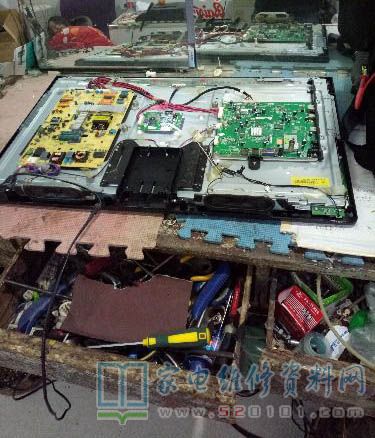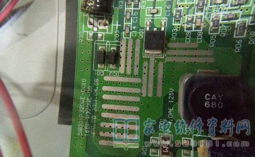 接修一台创维32E61HR LED液晶电视,故障表现为通电开机有开机声音没有光,打开后盖开机测灯条电压只有25v,用灯条检查仪检查4组灯条都能点亮,4组电压都60v左右,检查横流板发现D01、D02并联两二极管的两端短路,拆下D02测D01正常测D02短路,旧板找一二极管焊好,通电试机灯条电压正常了,屏亮了,接信号声音头像都正常了。