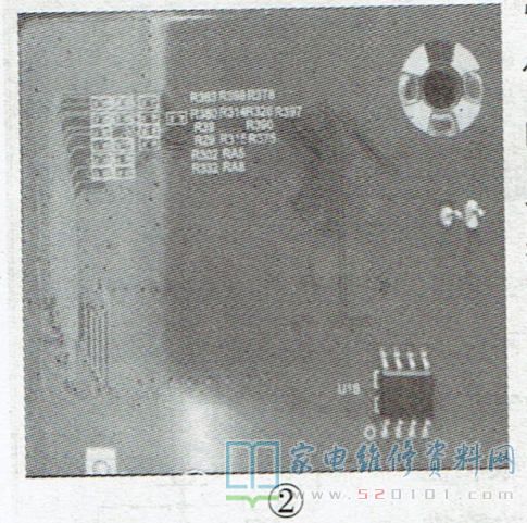 故障现象2:开机后屏上出现红、绿、蓝、白等光柵(俗称“七彩屏”)。分析检修:怀疑屏参或软件有问题,重烧软件和引导程序后故障依旧,检测主板上的各路电压也未见异常。咨询厂家技术人员得知,屏线接口处的几只贴片电阻易损坏,检测这几只贴片电阻,发现有两只电阻脱焊,补焊后故障排除,如图2所示。