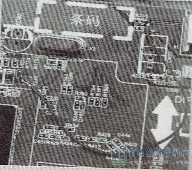 维修创维8S50/51机芯液晶彩电,易出现不开机或热机自动关机的故障,在排除主芯片虚焊后,先测量主芯片上方的电阻R235下端电压(正常值高于1V),如偏低,则测量R233左端的电压。该处电压与所用高频头种类有关:若用大高频头,则该处电压是10.9V;若用小高频头,该处电压是1.99V。若R233左端电压正常,则表明R233到R235之间的过孔漏电,这时切断R233下方的线路,并切断R235上方的线路,然后改用导线连接,如图1所示。