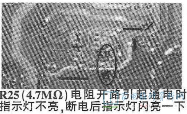 根据故障现象,可以判断故障是副电源不稳压或者是带负载能力差引起的。拔掉电源板上给主板供电的插件,通电后测量待机电压5V变为0V,关闭交流开关时待机5V只有几秒的输出,接上灯泡测量带负载能力,关闭电源时灯泡亮并且5V稳定。检查副电源IC外围稳压环路未见异常,代换光耦、TL431、反馈电容后故障不变,仔细检查才发现电阻R25(4.7MΩ)开路,如图1所示,代换后电源板故障排除。
