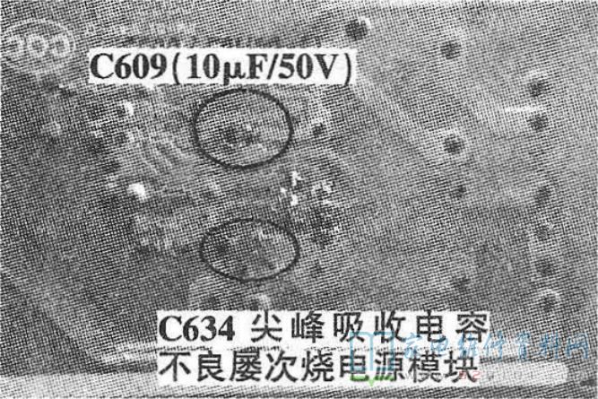 一台26英寸创维26L08HR型LCD电视,故障现象为不通电。电源板型号:5800-P26TQM-0010,电源高压一体板(其电路见本期64页)。拆板检查发现F601保险IC601 (W6556A )损坏, C616、C617、C622( 470uF/35V)电容鼓包,估计是因为电容漏电引起负载过大烧W6556。直接把损坏的元件全部换新,加电测量电源板次级输出电压5V、16V、24V正常,接上主板插件和灯管插件后试机,图像正常,正当试机中突然断电,经检查发现F601保险管、W6556A再次损坏,检查外围元件时发现电容C609(10pF/50V)容量减小为5.72uF,把C609和W6556A换新,不安装保险,在保险两端串入100W/220V灯泡,然后通电试机,灯泡闪亮一下就暗下去了,测量次级输出都正常,几分钟后串联的灯泡突然变得很亮,说明电源过流或者短路。断电后发现W6556A散热片非常烫,测量电源模块①脚和③脚已击穿,拆下后发现印制板.上的①脚和③脚孔位还是呈短路状,检查发现原来是并联在此脚上的C634尖峰吸收电容已击穿(因烧裂所以字迹模糊已经看不清,实际使用的47Ω/1kV电阻),用681Ω/2kV的电阻代换后通电试机,故障彻底排除,使用日久的电视机要仔细排除,电容变质的太多,稍不留神就烧电源模块,如图1所示。