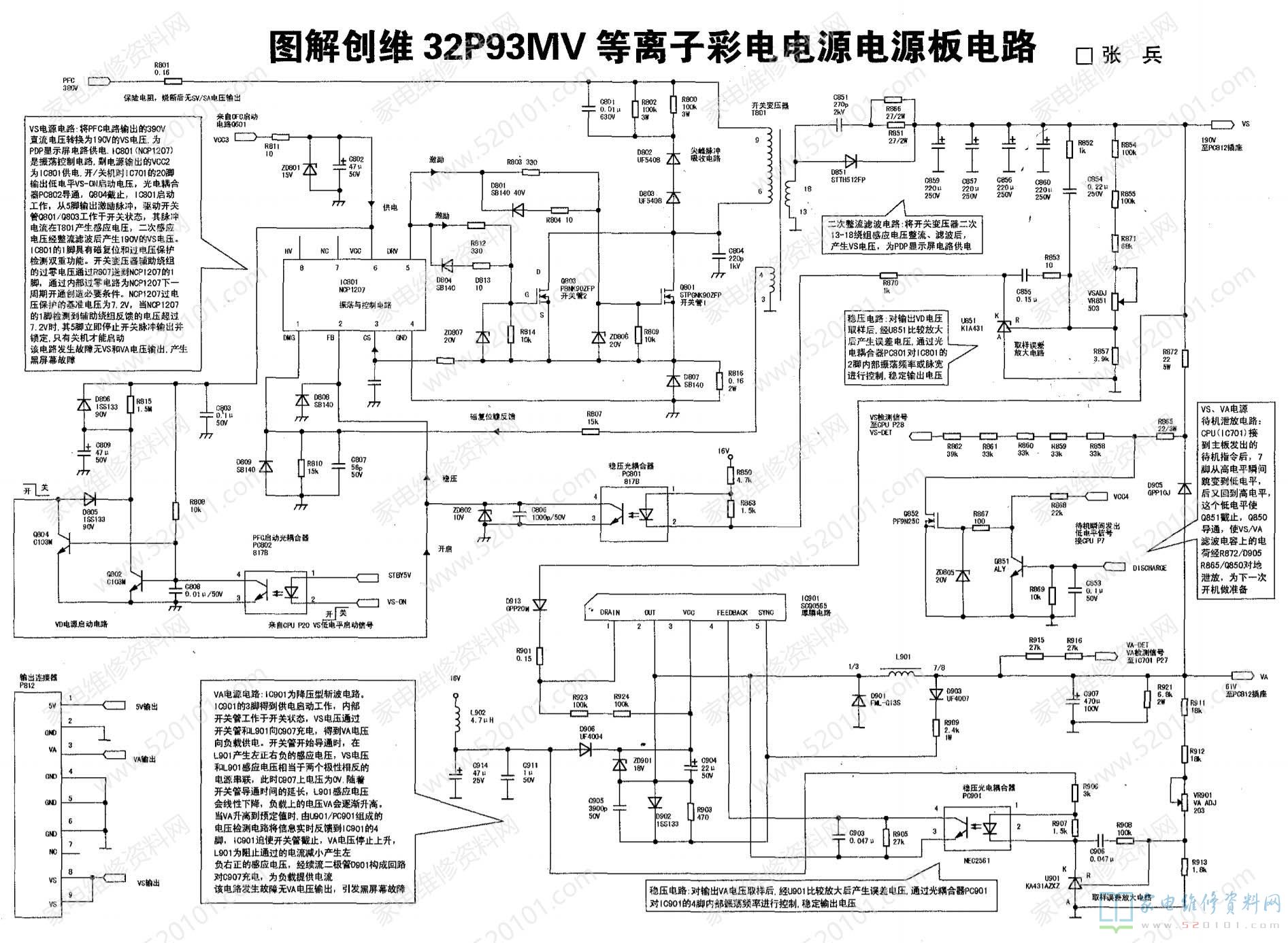 怀疑C804的损坏会殃及IC801(NCP1207),查资料得知用NPC1271P65可以直接代换NCP1207,于是就用NPC1271P65代换后试机,VS电压还是在0~10V间变化,在16V处接一只24V灯泡,灯泡一亮一灭,测量Q801场效应管D极电压为0V,没有300V供电电压,vS电路咋会工作?检查发现R806 (ICP2503A00SMT电阻开路(经查为3A水泥保险电阻)。由于没有这种配件,于是就用5W/1Ω的水泥电阻代换,通电后VS电压上升为120V左右就下跌,电源板有异常的叫声,怀疑所换元件不准确,于是找标准的220pF/2kV电容换上C804,又把旧的NCP1207装上通电,VS电压又回到从前,确认NCP1207已经损坏。从旧板上拆下一块NCP1207换上后通电, 16V处接的灯泡常亮,电源叫声消失。测量VS电压190V左右稳定,VA电压60V正常,5V、16V、9V输出都正常,把电源板安装到位插上所有插件后通电试机,电视机一切都正常。