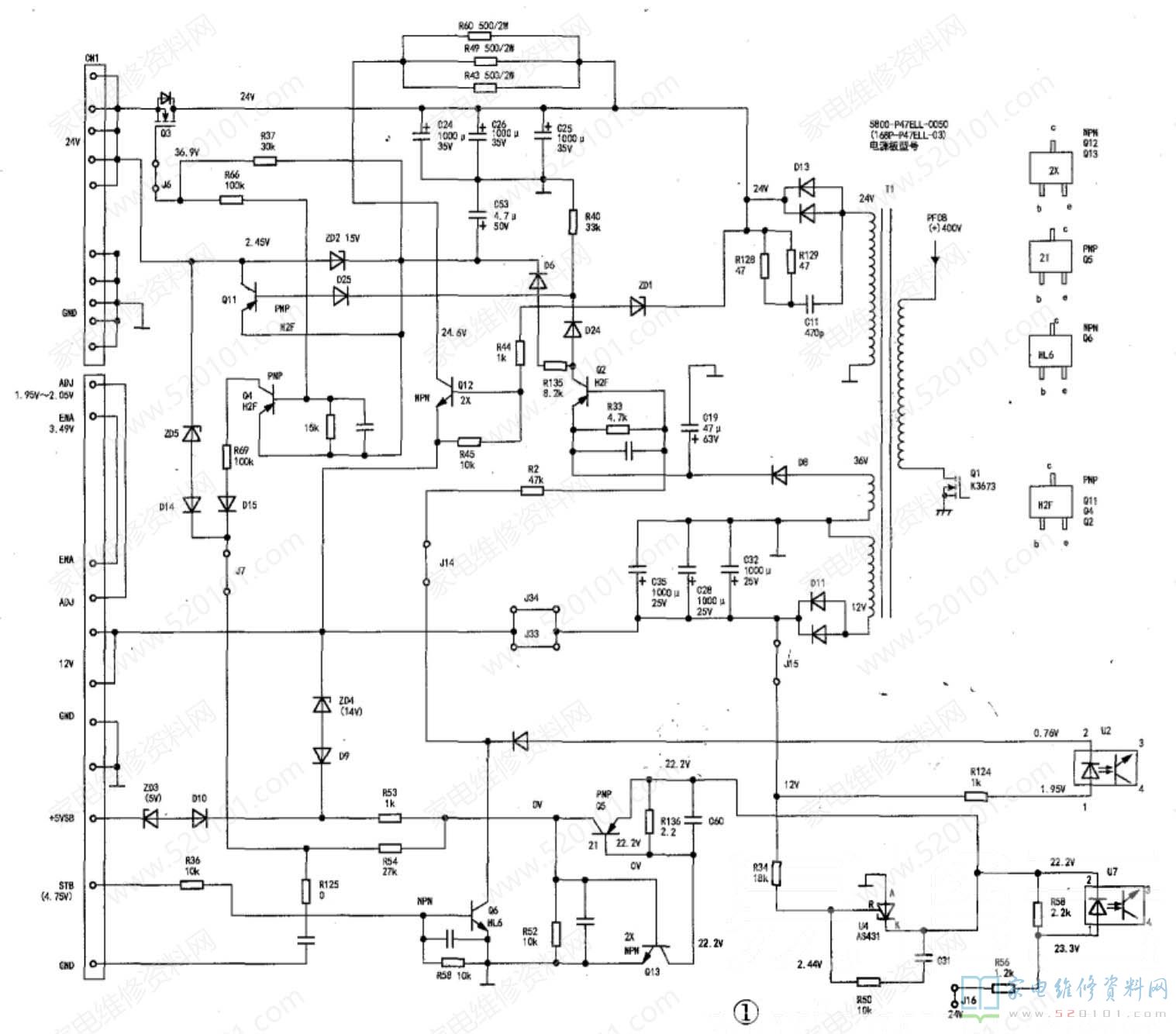 为了判别主板,屏等是否正常,决定先用一块正常的功率足够的有24V、12V、5V电源板替代。于是分别用粗电线焊接在24V、12V、5V端口上,通电试机,发现24V、12V一样会下降,但串接在220V电源上的1A交流电流表,未发现表针摆动,即无启动电流,正常串在220V交流电流表,整机有负载时交流电流上升到0.2A~0.5A。看来负载是很轻的,分析代替板电压下降,可能受原电源电路上元件影响造成的,决定断开有影响的J85、J33、J34、J12连线,及断开24V通断切换管Q3的S脚,通电再试,24V、12V 4V电压已稳定,指示红灯亮稳定,再按本机“电源“开机键,一会儿后1A交流电流表约有0.3A~0.4A指示,厂标字符的光栅出现,再插上AV信号,正常的图像及声音出现,看来该机的主板、屏等均是正常的,故障仅出在电源板上。从以上试机分析,电源板的故障应在电源的次级上。因无电路图,决定先实绘出开关电源次级电路,如图1所示。