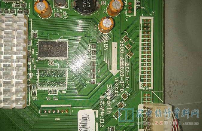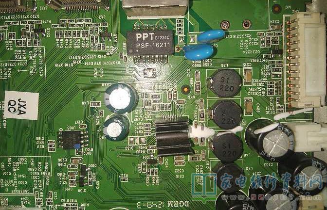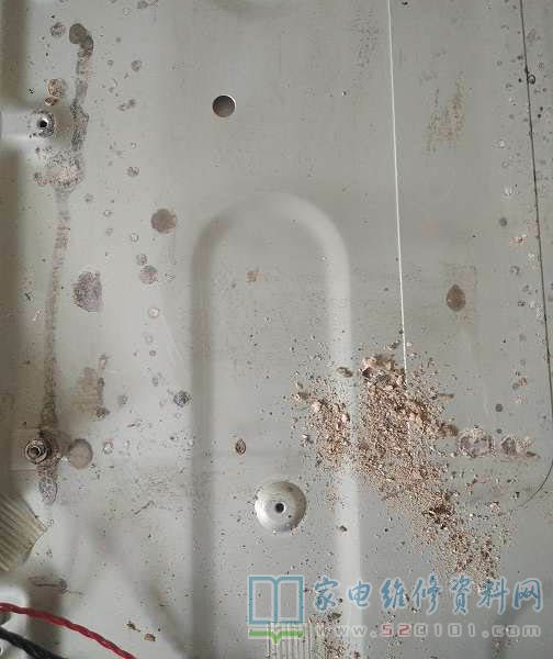 接修一台创维47E600Y液晶电视,故障表现为开机后就发出哒哒噪声,图像正常。伴音功放TAS5711。测24V供电正常,输出脚4.8V应该太低了。经过10多分钟后噪声消失依旧无声,这时输出脚电压7.8V。搜索TAS5711应用图参考检查外围没有发现损坏,怀疑芯片换一片后还一样。拆下主板后看到下面塑料片上很多像小水珠,现在我这几天都是高温干燥。用毛巾擦吹风机吹后塑料片上一片油渍,好像不是水珠。塑料片下面铁板也被什么腐蚀后留下像盐一样残留物。再仔细看主板重低音输出座有些油渍,拆下看两脚元件面有轻度锈蚀导致漏电。清洗后伴音正常,测量输出电压13.8V。索性从背面把两条铜箔割断了。