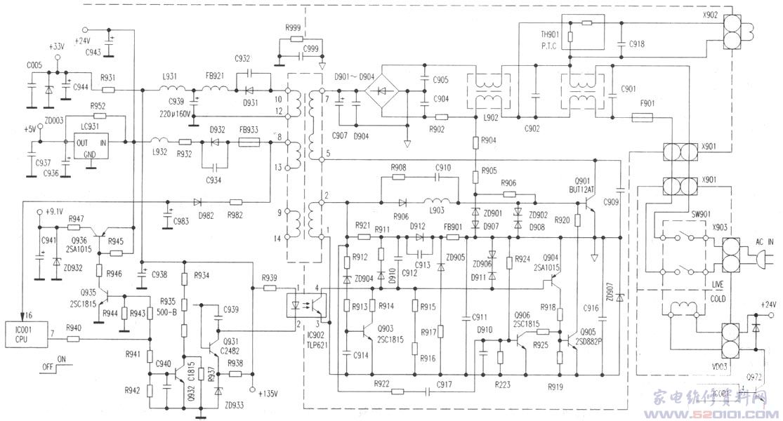 待机控制亦即遥控开/关机控制。当遥控关机时,CPU IC001⑦脚输出低电平,使Q932截止,因R937串在取样电路中,使得取样电压即Q901b极电压上升,Q931 b极电流和c极电流增大,因而流过IC902内的发光二极管电流增大,光敏三极管内阻大幅下降,误差电流的增大控制Q904和Q905进入导通状态,由于Q905的c、e极小电阻分流作用,使得Q901导通时间缩短,开关脉冲占空比下降,开关变压器感应电压下降,开关电源处于间歇振荡状态,输出能量下降使各组输出电压下降幅度增大,为正常输出值的一半弱,但+24V端的可输出+12V左右的电压,以保证IC931稳压输出为+5V以供CPU之用。当遥控开机时,CPU⑦脚输出高电平,Q935、Q932导通,重复与待机相反的过程,使得开关脉冲占空比上升,开关电源恢复正常振荡过程。