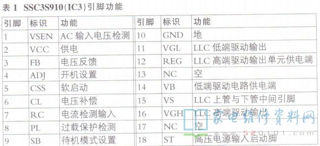 接修一台60Q8型机,开机收看-段时间后自动关机不能再开机,但一段时间后又能开机,几分钟后又自动关机,且正常收看的时间越来越短。分析检修:该机采用8H91机芯,开关电源组件型号为168P-L6K012-01,PFC芯片采用FA5696N,开关电源芯片采用SsC3S910,背光控制芯片采用PF7900S。根据故障现象分析,怀疑主板或开关电源电路中某元件热稳定性差。拆机后,首先用吹风机对电源组件加热,发现电源供给主板的12V电压波动,由此判定故障部位在开关电源中。测PFC电压滤波电容CE13、CE14两端电压为380V且稳定,怀疑12V电压形成电路有故障。该电路由ssC3S910(IC3)、高低边开关管Q6.Q8和变压器T1组成。SSC3S910 各脚功能见表1。