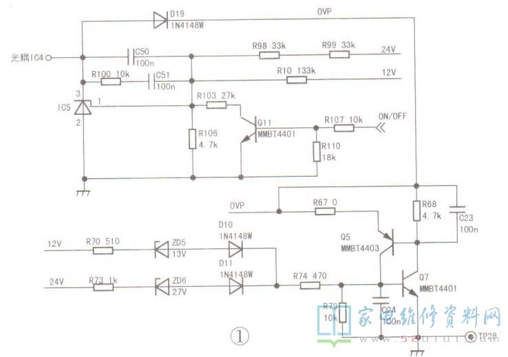 测IC3②脚vcc供电为13.5V,正常值应为14V。检测⑧脚启动供电通道中的电阻R77、R81正常,①脚交流电压监测端电压为1.3V,也正常。检测③脚(FB)外接稳压控制电路,如图1所示,发现断开D19后,故障不再出现。检查与D19连接的Q7、Q5、ZD5、ZD6等元件,发现Q7热后c-e结导通电阻大幅变小,更换Q7后开机,故障排除。