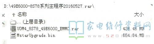 方法如下:先将该机型所用主程序"MstarUpgrade.bin"拷贝到U盘根目录下,如图所示,然后将U盘插到电视机的USB2.0端口中,按住键控板.上的“确定"键交流开机,电视机自动进入升级状态,随后电视机自动重启,故障排除。