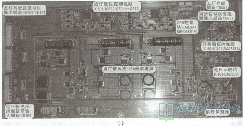 插座CN602:驱动板与背光驱动板之间同步信号和误差控制信号的连接插座。若驱动板发生故障,将通过插座CN602反馈至背光驱动板中的CPU,使其停止工作而保护。