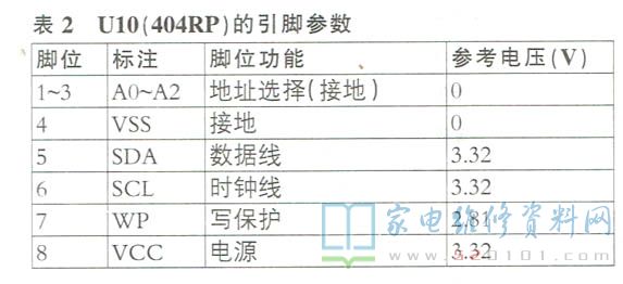 由电源管理块U5( TPS65162 )的23、24脚产生的vcc(3.32V)电压,通过取样电阻R123.R124得到SDA.SCL电压,送入存储器U10( 404RP)的⑤、⑥脚,与LVDS接收、格式变换和时序控制块uc1(R8J01076FP )的190、191脚进行数据信息交换。
