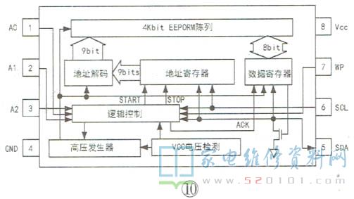 404RP是一个512x8bit可擦除、可编程的存储器,内部框图如图10所示,引脚参数如表2所示。